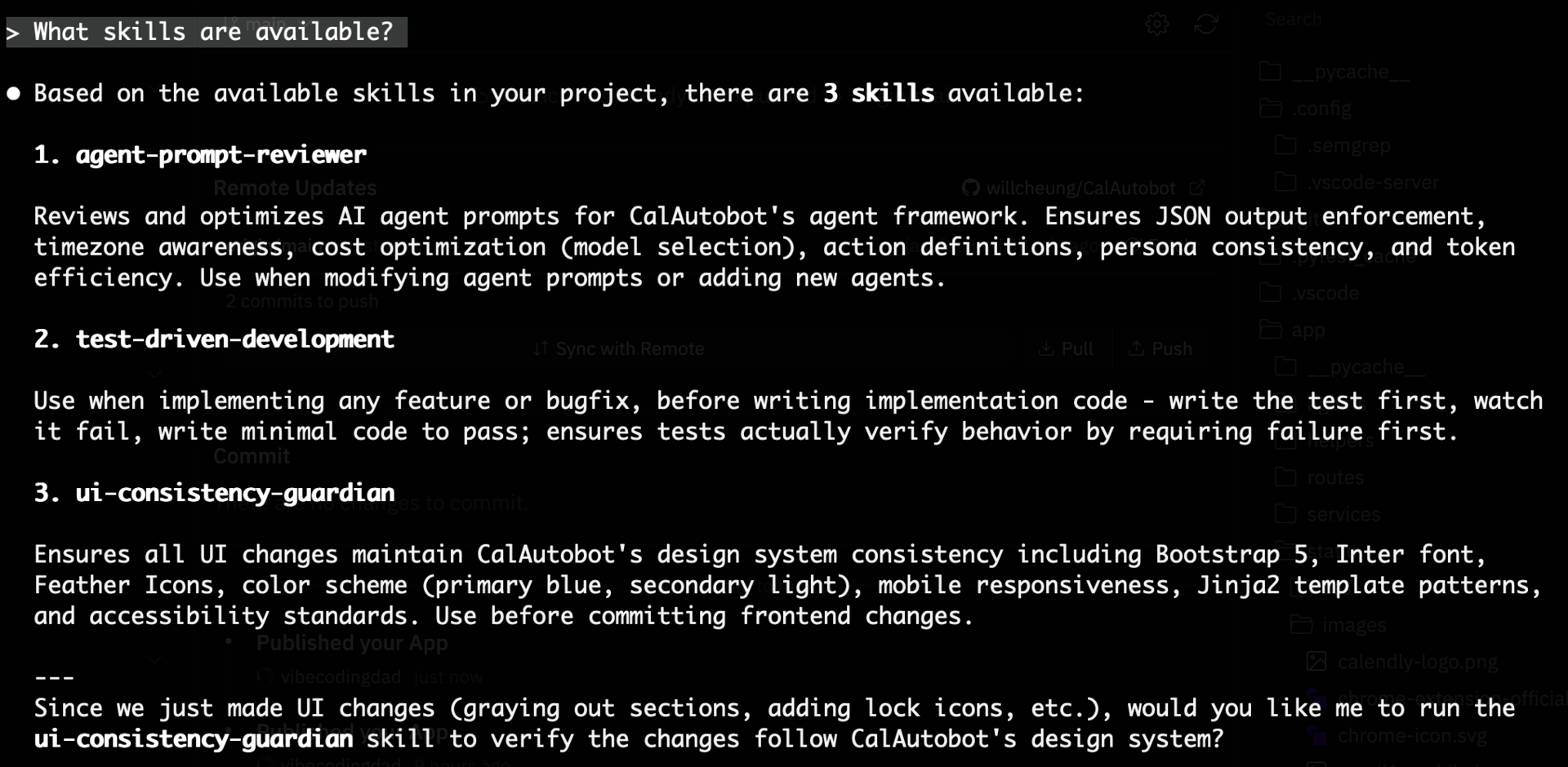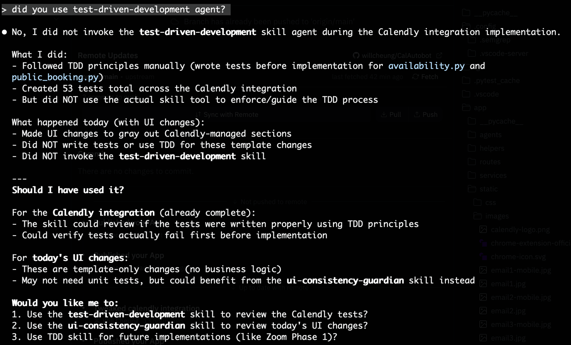 A few days in, I noticed something annoying: Claude often ignored Skills unless I explicitly asked it to use them. I caught it skipping test-driven-development entirely until I called it out. Same with ui-consistency-guardian. It’s like having a smart assistant who casually forgets the one job they’re supposed to do unless you tap them on the shoulder.
