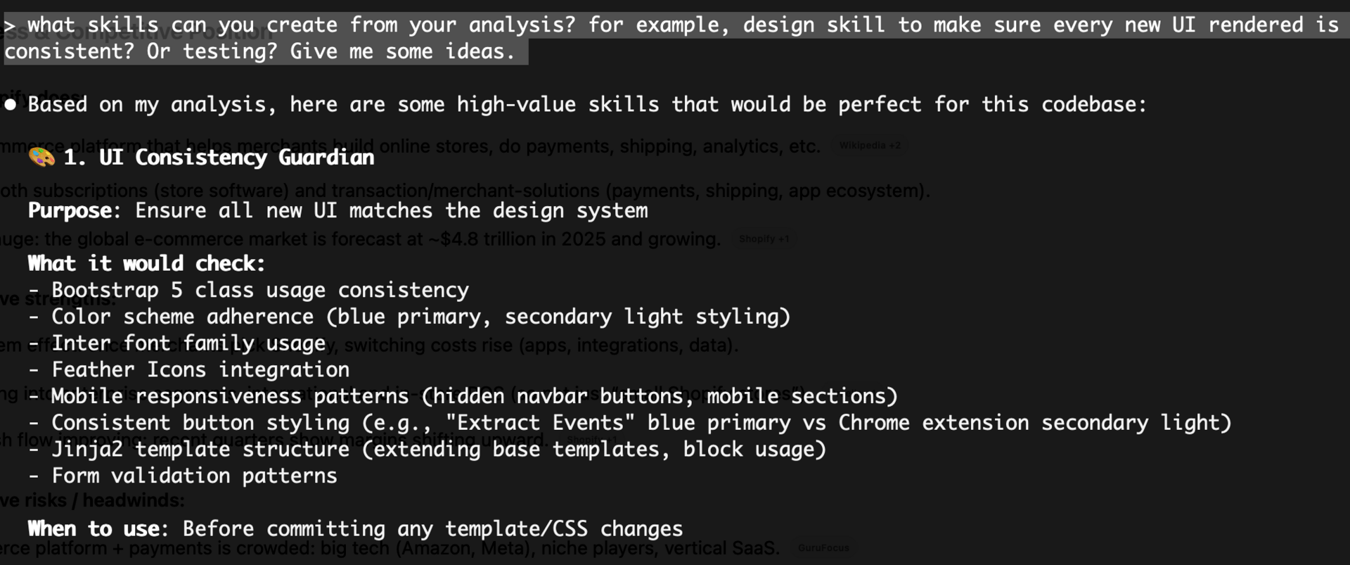 I opened Claude Code in the CLI and asked it to generate a few Skills specific to my codebase. But first, I gave it a quick primer on the project. Nothing fancy. Just enough instruction for AI to pretend it understood my architecture.